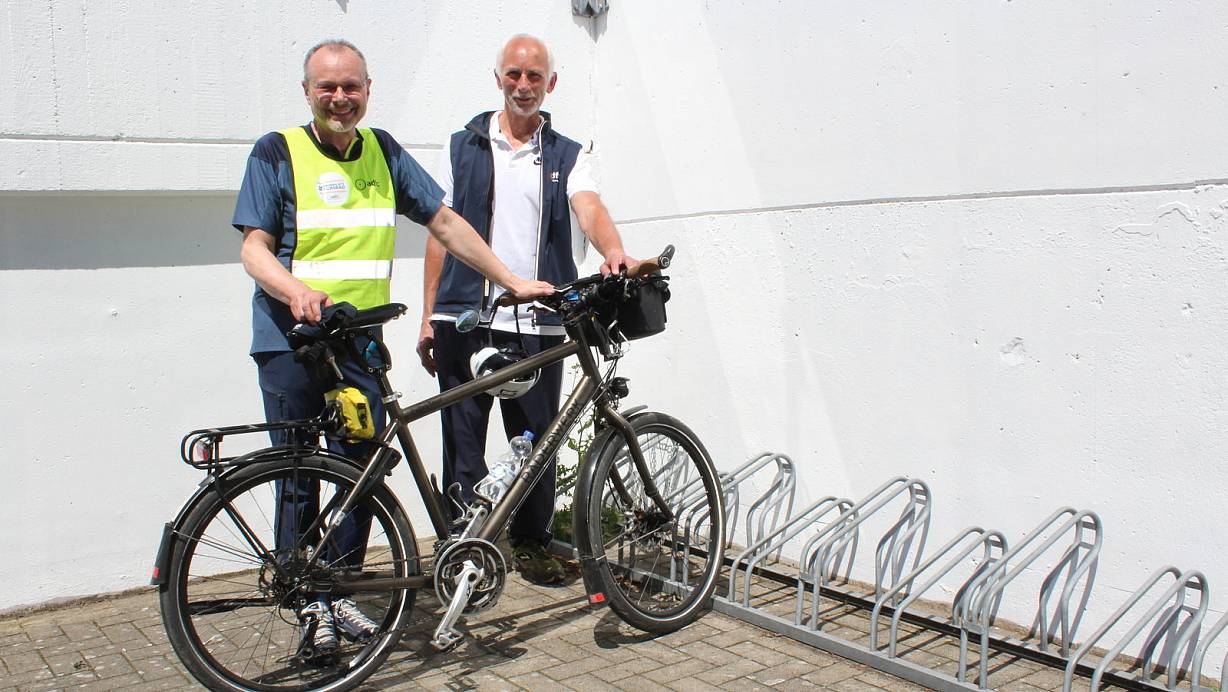 Uwe Diekmann und Gottfried Sielmann (v.l., ADFC Enger-Spenge) bemängeln, dass es an öffentlichen Sporteinrichtungen keine vernünftigen Fahrradständer gibt.  | © Karin Wessler