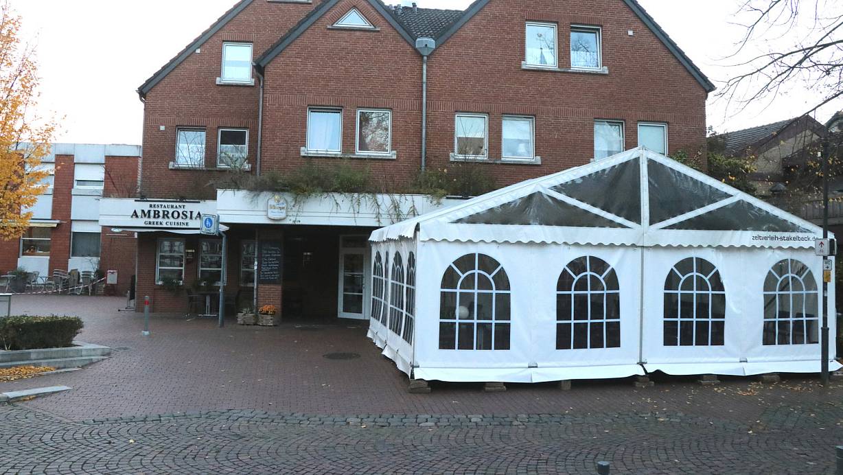 Erst vor ein paar Tagen hatte Dimitrios Papadakis vor seinem Restaurant "Ambrosia" am Barmeierplatz ein Zelt aufgebaut. | © Andreas Sundermeier