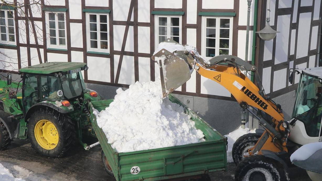 Ein Radlader lädt in Enger an der Burgstraße/Ecke Mathildenstraße Schnee auf einen Traktorenanhänger. | © Ekkehard Wind