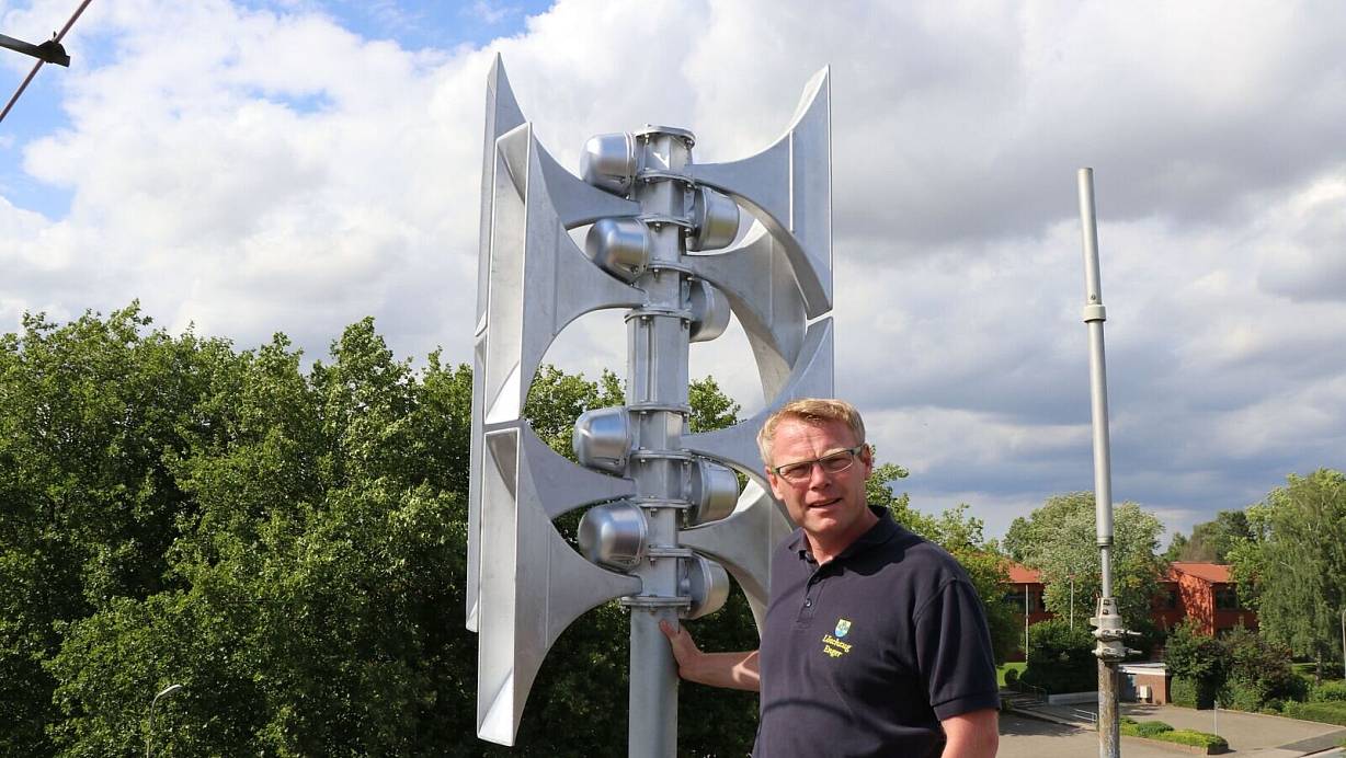 Diese moderne Sirene ist auf dem Dach des Feuerwehrgerätehauses Enger-Mitte installiert. Arndt Höpker, stellvertretender Feuerwehrchef in Enger, inspiziert sie. | © Ekkehard Wind
