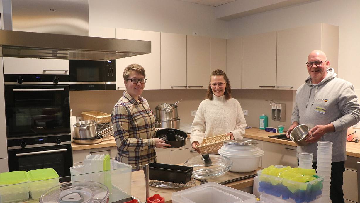 Letzte Arbeiten: Die Küche im Gemeinschaftsraum muss noch eingeräumt werden. Einen Überblick verschaffen sich Jennifer Liebscher (v. l., Hausleitung), Kimberley Wilmsmann ((Pflegedienstleitung) und Bereichsleiter Thomas Blankenhagen. | © Ekkehard Wind