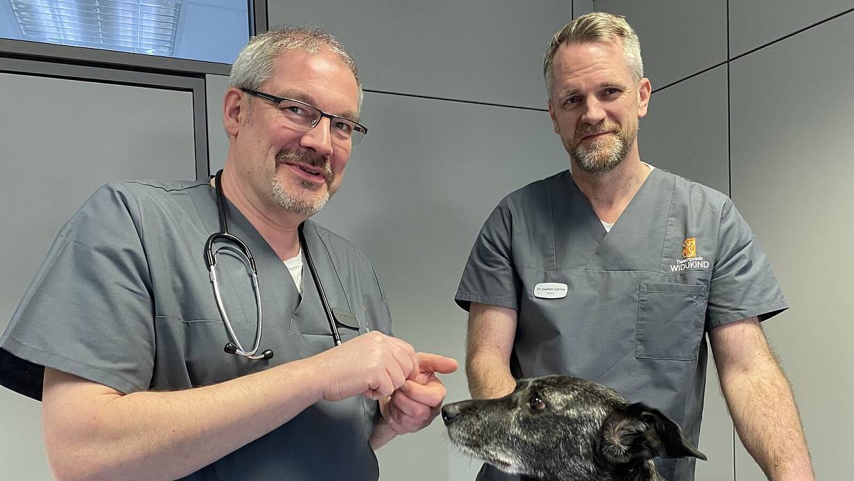 Dr. Carsten Plischke (l.) und Dr. Joachim Schöne aus der Tierpraxis Widukind mit der an Morbus Addison erkrankten Hündin Greta. | © Lillia Seifert