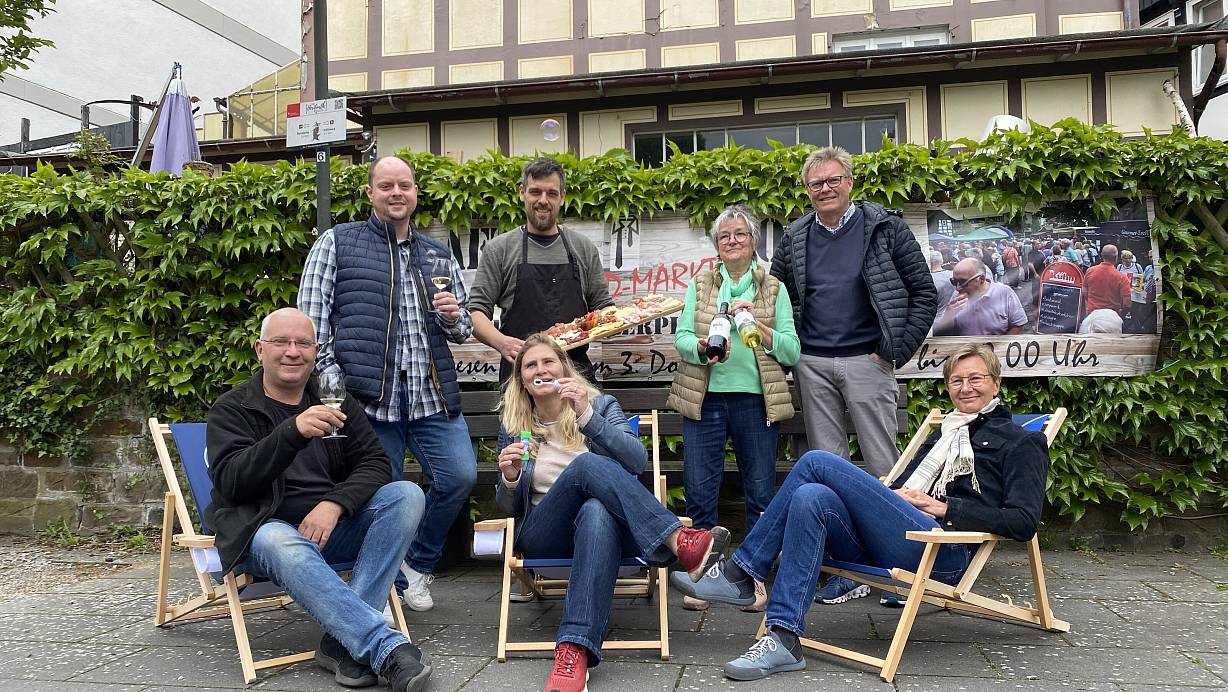 Freuen sich auf den Abendmarkt: Carsten Müller (PES, v. l.), Matthias Kühn (Fleischrei Kühn), Daniel Degrassi (Degrassi Gourmet), Daniela Dembert (KuV), Jutta Friedhoff (Weine & Accessoires) sowie Fritz Althoff und Angelika Weitkamp (Kaufmannschaft) auf dem Barmeierplatz. | © Lillia Seifert