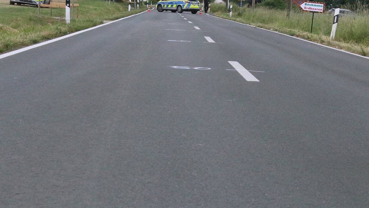 Zahlreiche Markierungen auf der Meller Straße zeugen von dem schweren Verkehrsunfall, bei dem ein 59-jähriger Mann aus Hiddenhausen tödlich verletzt wurde. | © Claus Frickemeier