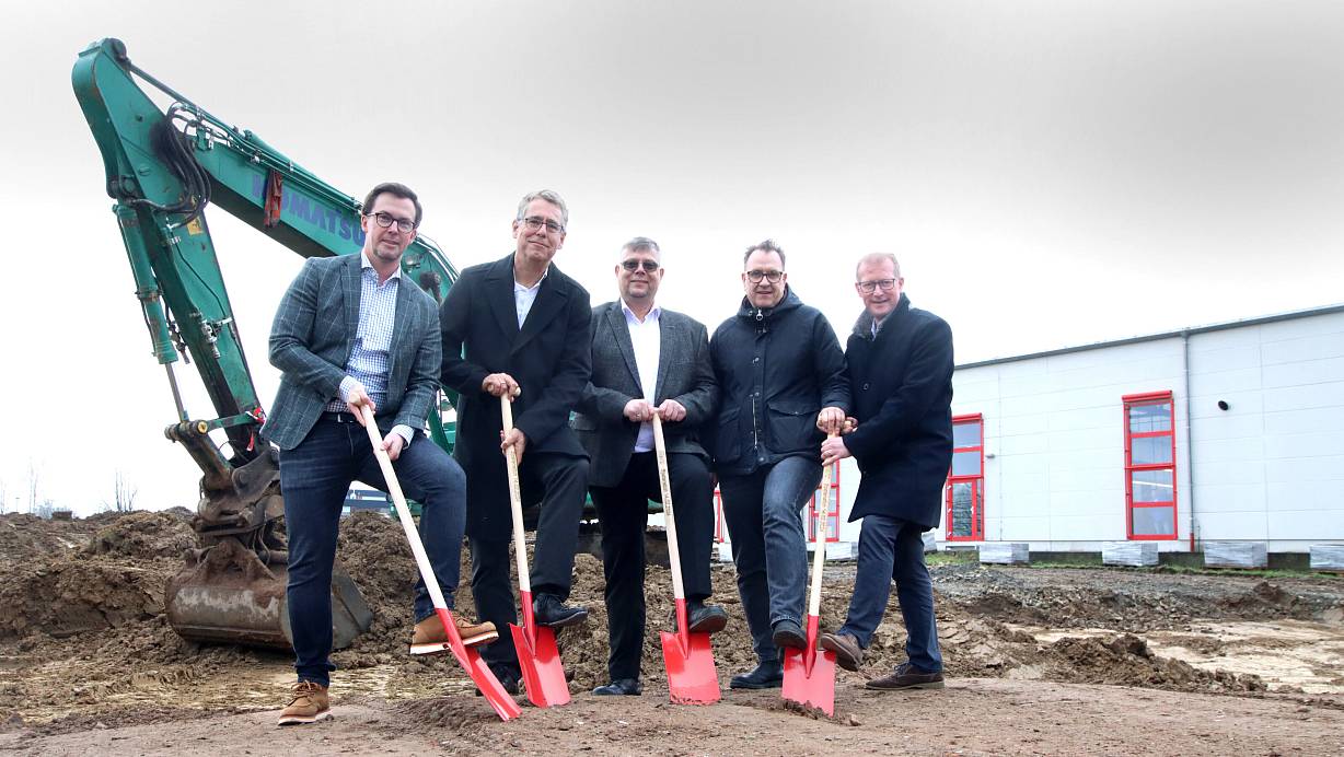 Zum 2-Millionen-Euro-Spatenstich trafen sich am Mittwochmorgen Alexander Abke (v.l.), Philipp Andrae, Axel Pollmann, Andreas Adler und Thomas Meyer dort, wo die Vorabeiten für den Hera-Anbau schon angelaufen sind. | © Andreas Sundermeier