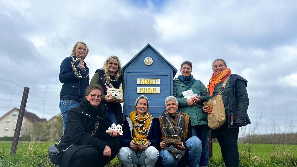 Die ausstellenden Künstlerinnen vor dem neuen Kunst-Kiosk in Enger. | © Danielle Dörsing