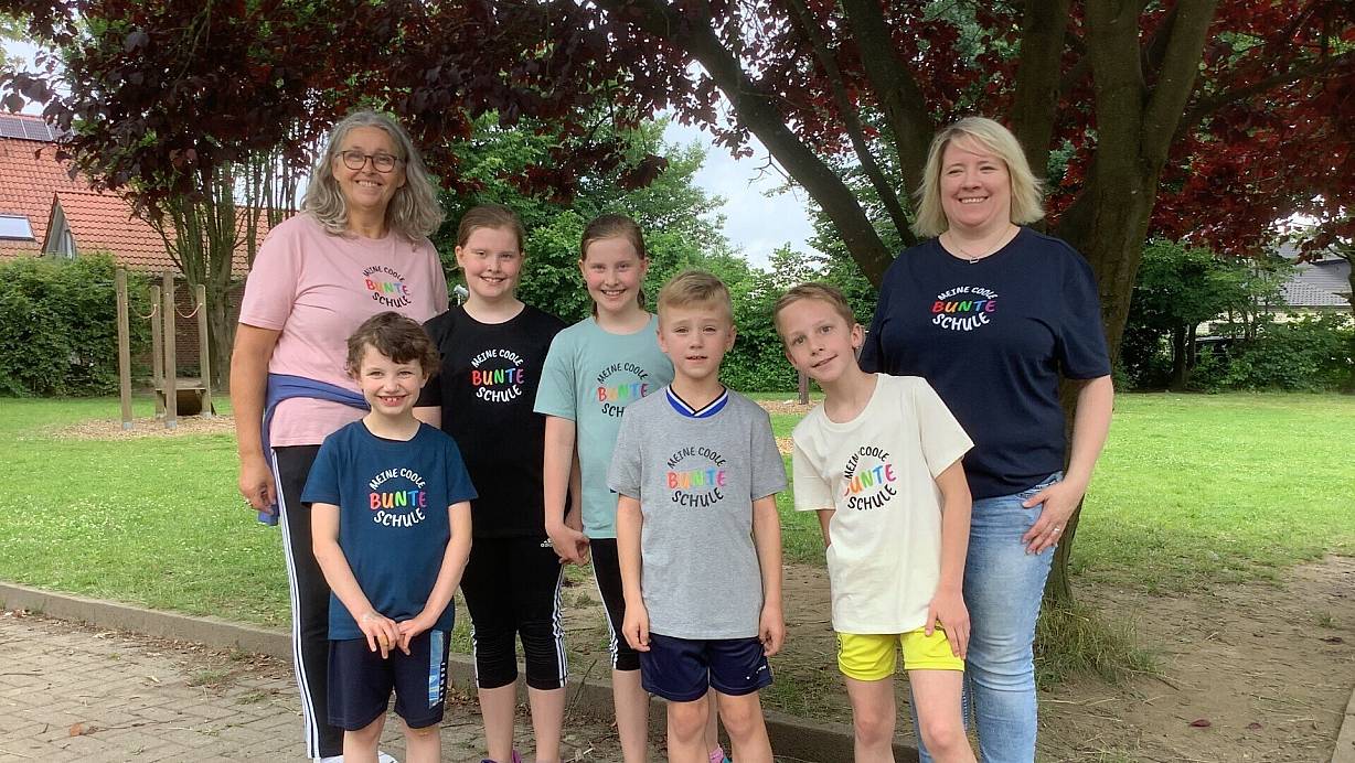 Schulleiterin Annegret Holz (v.l.), Juna, Finja, Lenja, Joshua, Julius und Konrektorin Astrid Weigmann präsentieren ihre neuen Schul-T-Shirts. | © Grundschule Belke-Steinbeck/Besenkamp