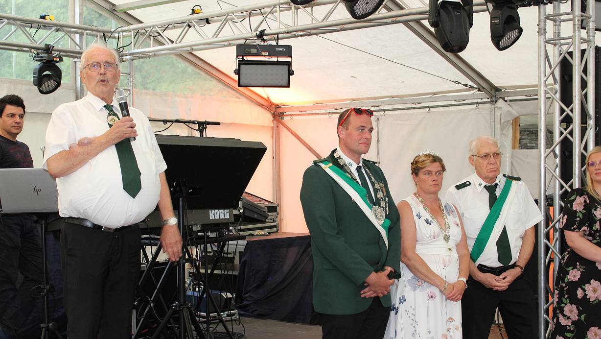 Der erste Vorsitzende Ulrich Brünger verkündet, dass es keine Nachfolge-Majestät geben wird. Daniel Niestradt und Stefanie Janßen (beide rechts im Bild) sind das vorerst letzte Königspaar. | © SV Oldinghausen