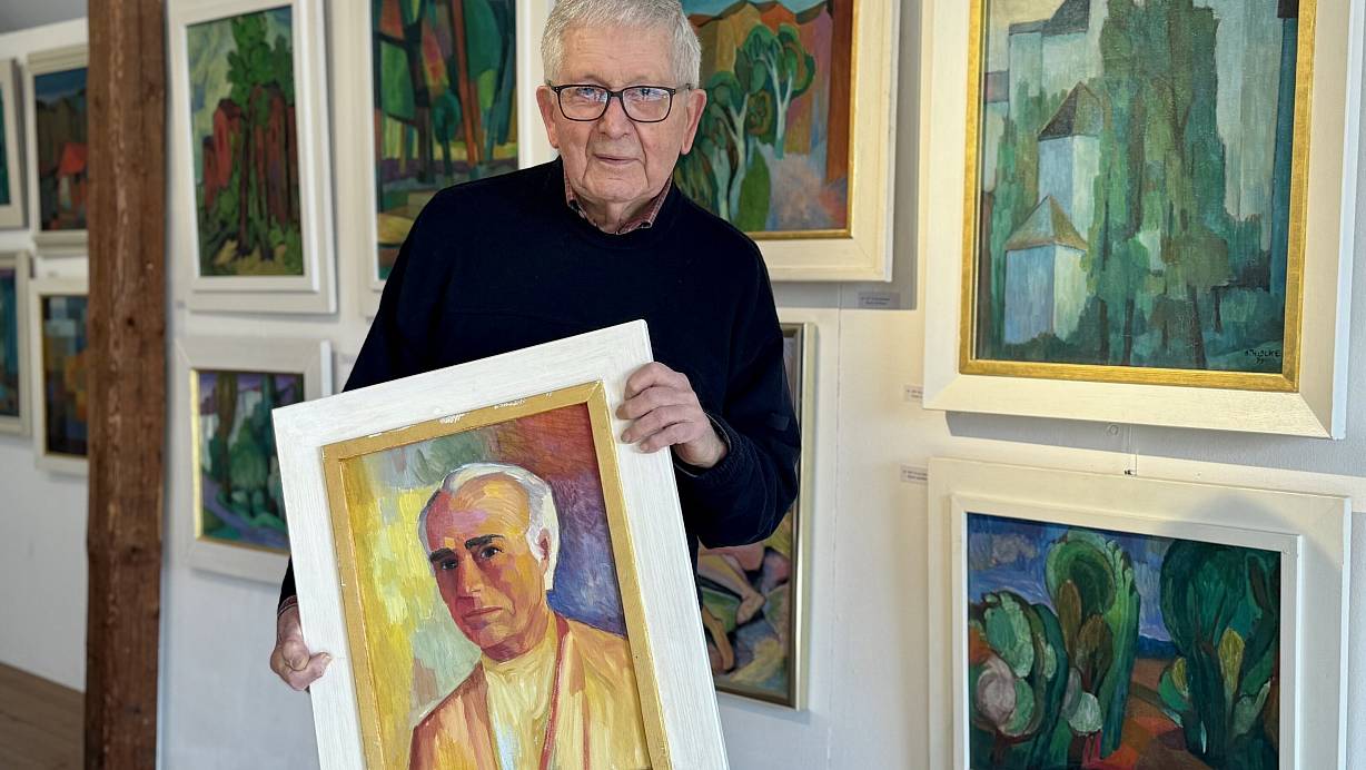 Günter Richter - hier mit einem Selbstbildnis des Malers - hat die Werkschau über das Lebenswerk von Otto Klocke zusammengestellt. | © Britta Bohnenkamp-Schmidt