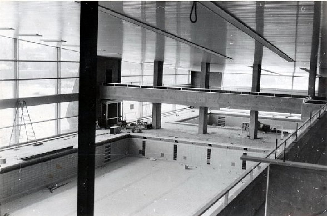 Doch halt, so weit sind wir 1964 ja noch nicht. Die Freie Presse gab auch einen "historischen Rückblick": Der Beschluss, das Hallenbad am Rande der Werregärten zu bauen, war im Stadtrat am 16. Januar 1962 gefasst worden. Am 28. März 1962 beschloss der Hauptausschuss, einen Ideenwettbewerb auszuschreiben. Bereits am 2. November 1962 wurde dem ersten Preisträger, Heinz Goesmann, die weitere Entwurfsbearbeitung übertragen. Grundsteinlegung war am 11. Juni 1964 und Richtfest am 11. Dezember 1964.
