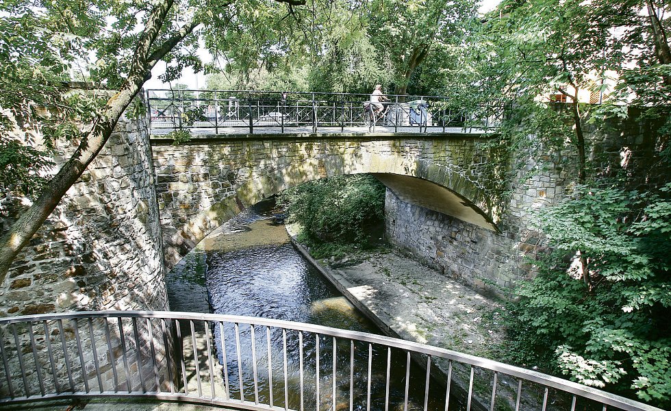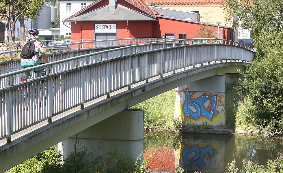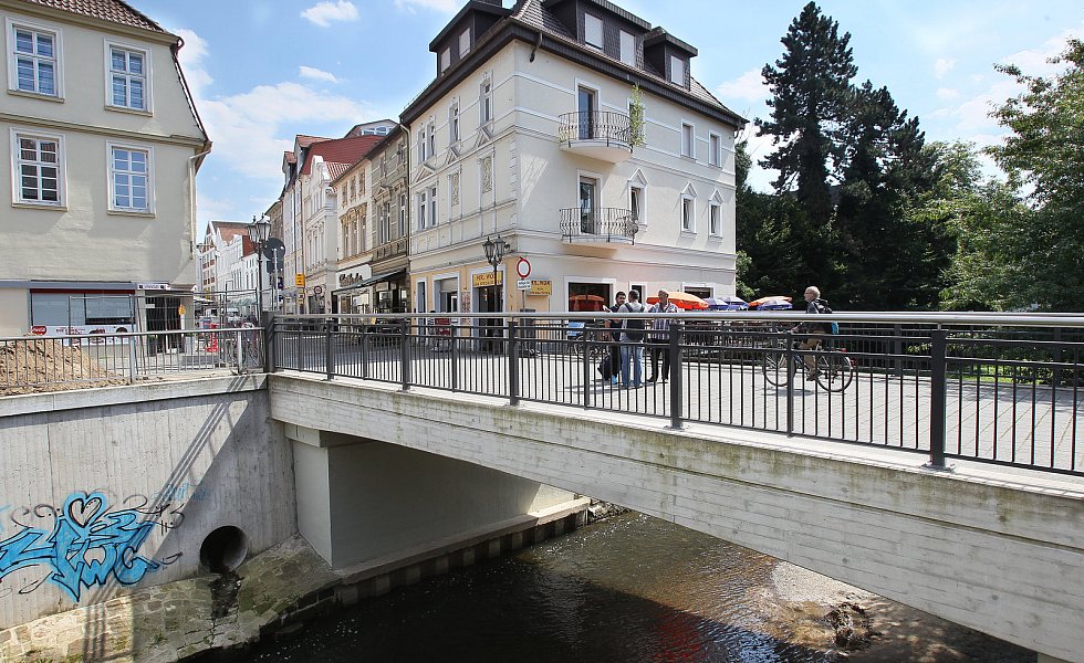 Und noch eine Flussbrücke wird von den Blicken selten gestreift: die am Amtsgericht. Sie ist eine graue Maus unter den Bauwerken, hat aber wohl mit die meiste Last zu tragen. Denn fast der gesamte Innenstadtverkehr über Berliner Straße und Auf der Freiheit „überrollt“ sie Tag für Tag.