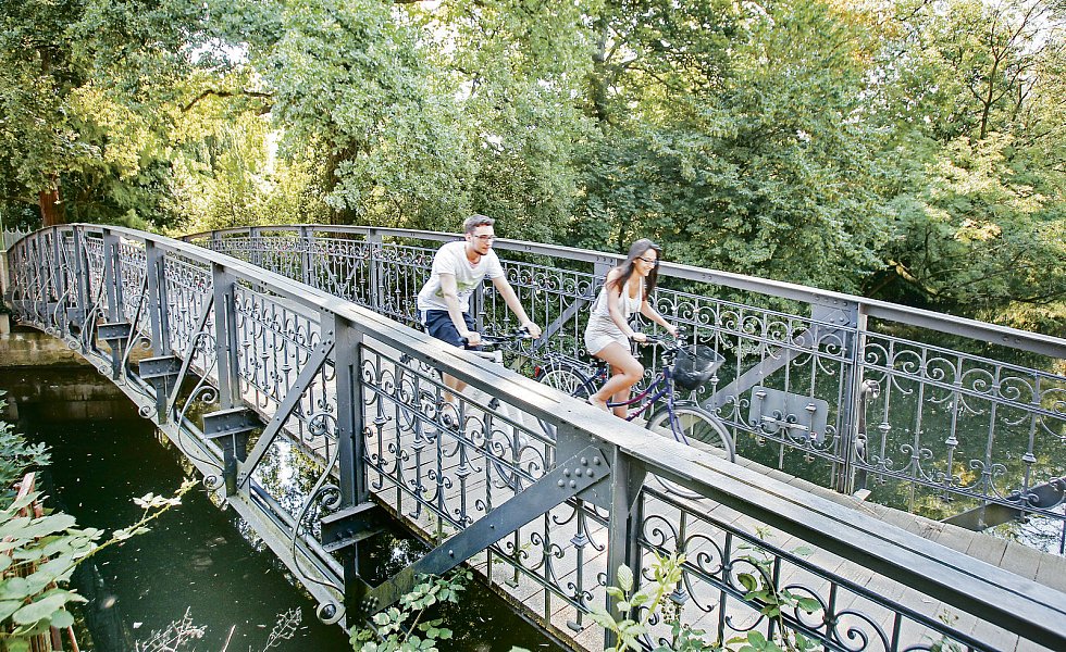Historische Brücken sind rar gesät, die älteste ist die Steintorbrücke gegenüber dem Go Parc. Sie stammt aus dem Jahre 1808 und wurde von einem französischen Festungsbaumeister geplant. Das schönste Brückenbauwerk ist zweifellos die Hertabrücke. Die auf Bruchsteinen ruhende elegante Eisenkonstruktion mit Jugendstilcharakter und Holzbeplankung überspannt die Aa an ihrer schönsten Stelle oberhalb des Radewiger Wehrs.