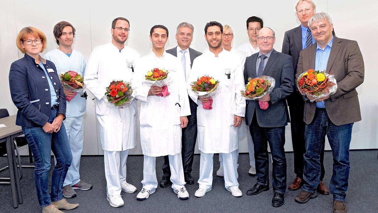 Team für die Notunterkunft: Elke Schmidt (Pflegedirektorin), Steffen Grautoff (Oberarzt Kardiologie), Alexander van Zelewski (Oberarzt), Osama Qattous (Arzt), Rudolf Küster (Vorstand), Issam Istaitih (Oberarzt), Stephanie Werth (Oberärztin), Wilfried Schnieder (Oberarzt), Manfred Pietras (Verwaltungsdirektor), Martin Eversmeyer (Vorstand) und Holger Finkemeier (Oberarzt). | © NW