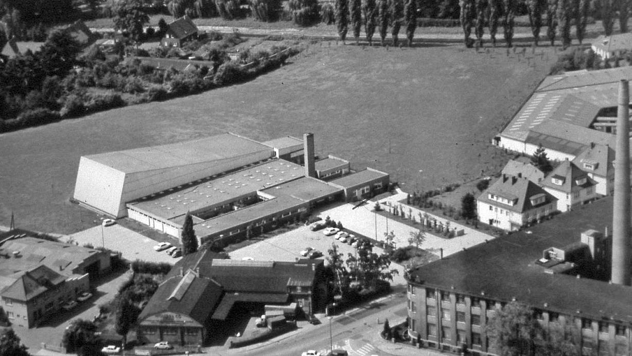 Typisches Pult: Unter der höheren Seite des Hallenbaddaches stand der Sprungturm. Das Friedrichsgymnasium steht noch nicht an der Werre im Hintergrund. | © Kommunalarchiv