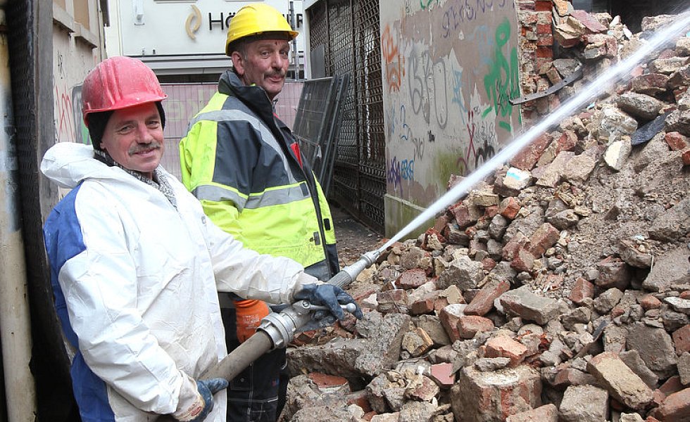 Bis Mitte nächster Woche soll diese Feinarbeit abgeschlossen sein. "Mit dem Bagger hätte ich dafür zehn Minuten gebraucht", lacht Uwe Neurath, der nach Abrissende mit seinen beiden Kollegen an der Häuserecke von Bäckerstraße und Waisenhausstraße 3.000 Tonnen Bauschutt verarbeitet haben wird.