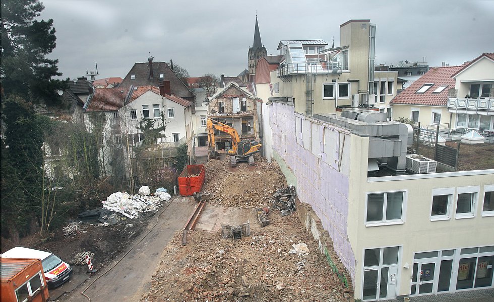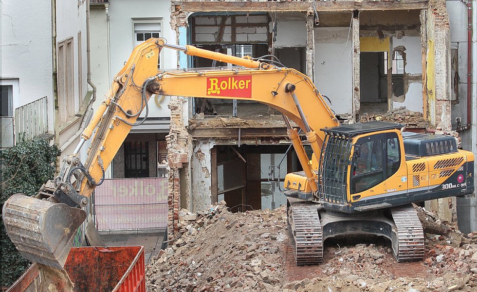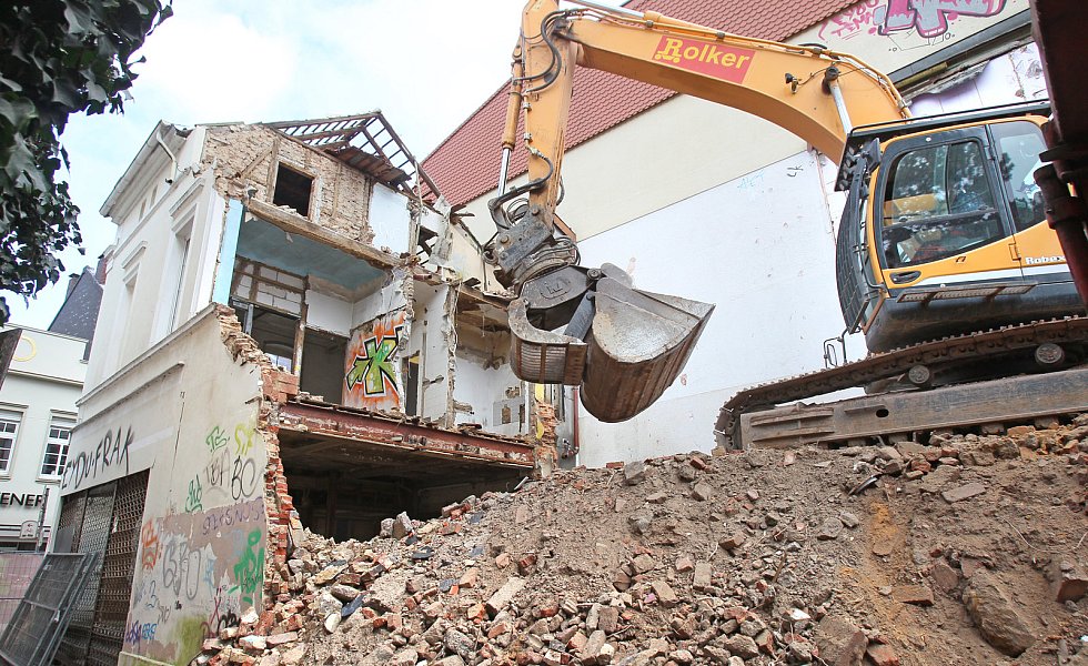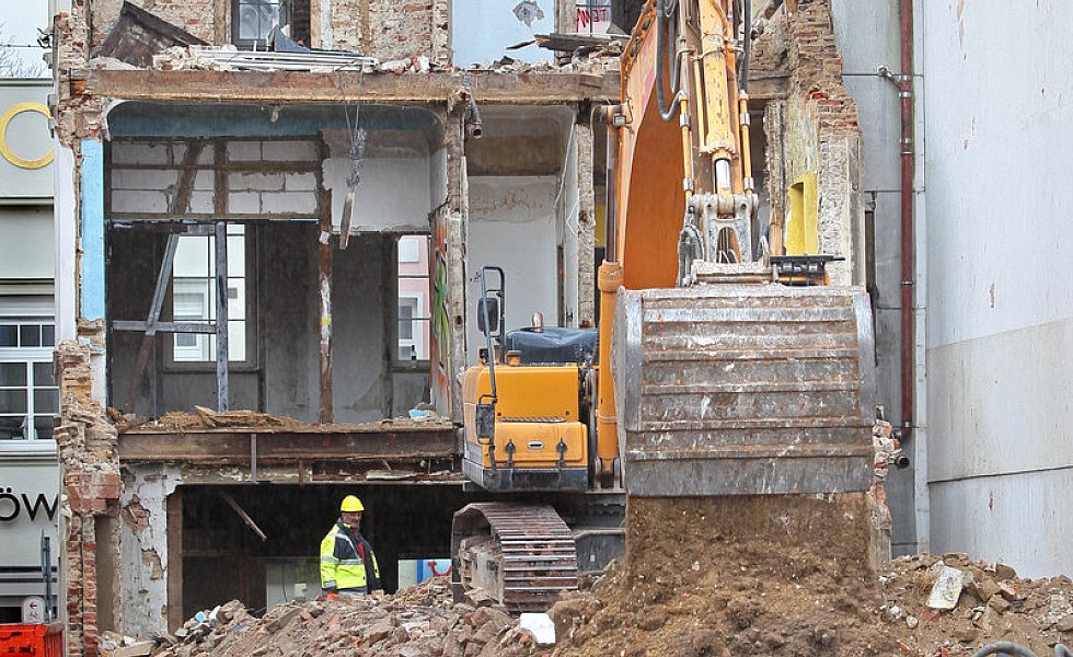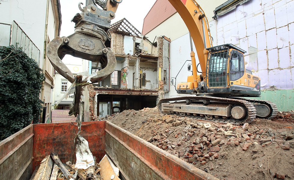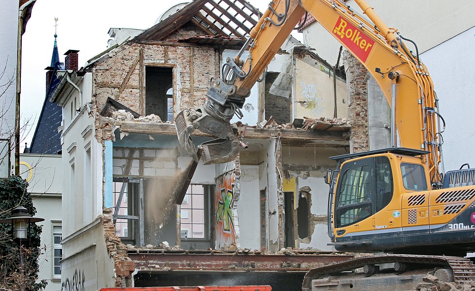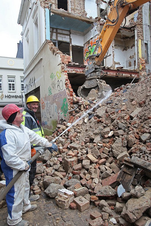 Von der Bäckerstraße selber war bislang allenfalls etwas zu hören, aber noch nichts vom Abriss zu sehen. Den hatte die Stadt eingeleitet, weil die Sicherheit des Objekts nicht mehr gewährleistet war. "Das ist eine Zwangsmaßnahme, mit der neues Landesrecht umgesetzt wird", sagte Bürgermeister Tim Kähler, als der sich zum Auftakt selbst in den Bagger gesetzt hatte.