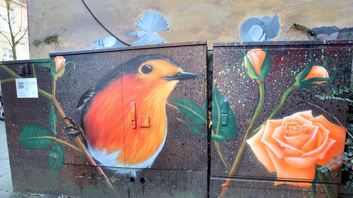Rotkehlchen im Rosenbusch: Am Rand des Fürstenauplatzes schaut das Vögelchen munter in die Welt. Der Künstler hat Gefieder und Blütenblätter in der Farbe aufeinander abgestimmt.