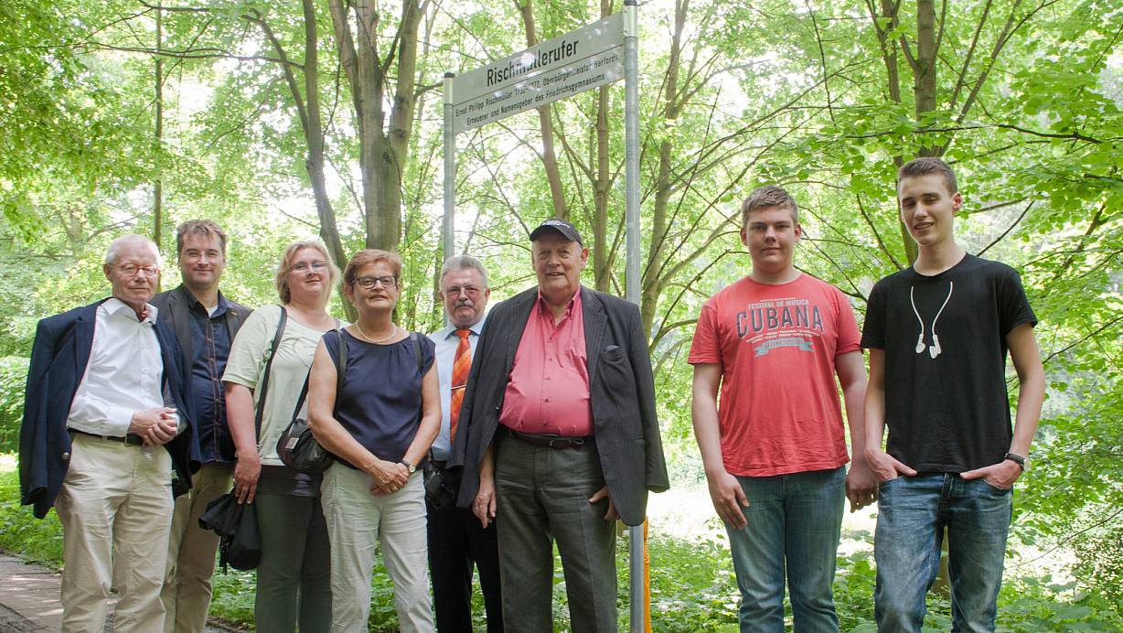 Jetzt ist es offiziell: Ralf Grebe (Mitte hinten) weihte das Rischmüllerufer ein. Katrin Böhme (3. v.l. , stellvertretende FGH-Schulleiterin), die Schüler Justus Müller und Daniel Teubner bedankten sich für das Engagement von Detlev Piekenbrock, Birgit Killmer, Andreas Gorsler und Henning Kreibohm. | © Ralf Bittner