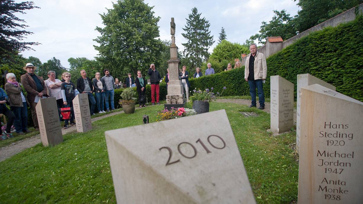 Zentraler Ort: Regisseur Gunther Möllmann (l. mit Hut) und Friedrich Brünger (r.) auf dem Grabfeld der Erinnerung. Hier rezitierten sie Texte um "Glaube - Liebe - Hoffnung", so der Titel des Tanz- und Theaterprojekts auf dem Marienfriedhof. | © Ralf Bittner
