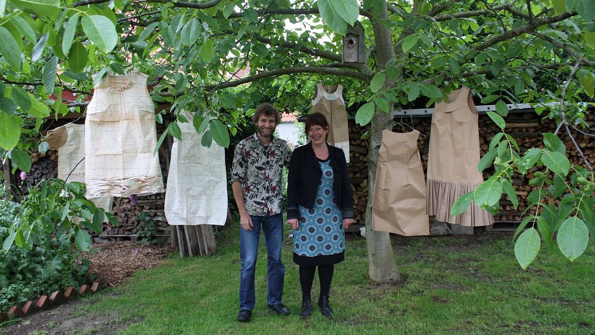 Natur und Mode: Clotilde und Theo Bonhert in ihrem Garten vor Papierkleidern, die Clotilde gemeinsam mit Schwesternherz entworfen hat. | © Privat