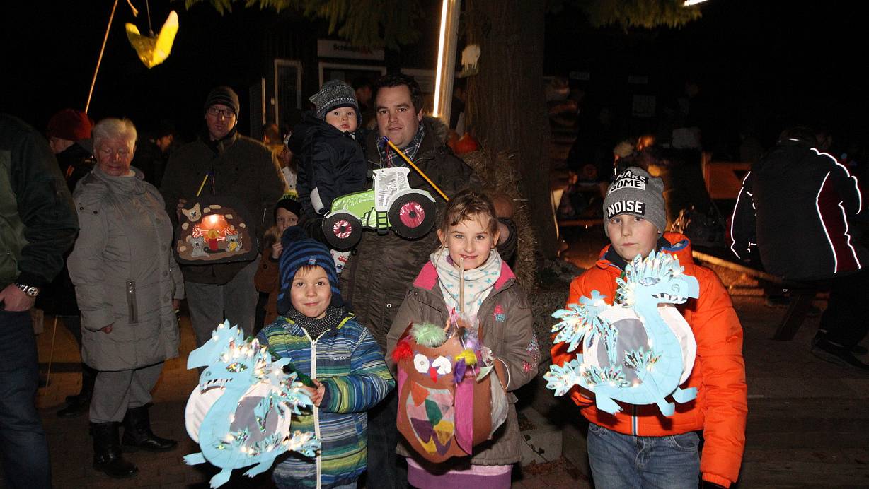 Sieger des Laternen-Wettbewerbs: Der fünfjährige Till (v.l.), Johann (auf Arm seines Vaters), Lea und Michel (beide 8 Jahre) freuen sich. Die Kinder haben zum Teil wochenlang an ihren Laternen gearbeitet. Mit Erfolg: Lea erhält eine Familien-Jahreskarte für den Tierpark, die anderen Kinder bekommen mehrere Freikarten. | © Jobst Lüdeking