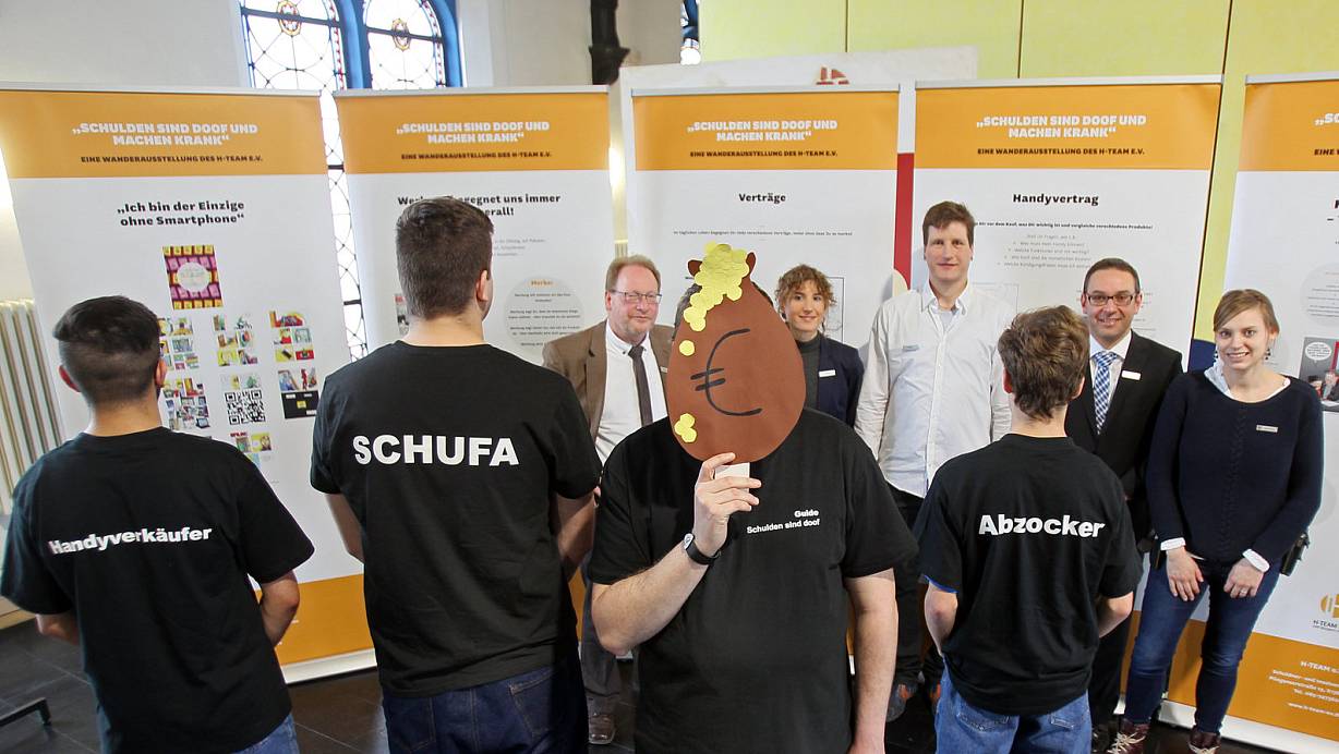 In der Schuldenfalle: Vier junge Gefangene führen als Handyverkäufer, Schufa-Mitarbeiter, Gerichtsvollzieher und Abzocker durch die Ausstellung. | © Frank-Michael Kiel-Steinkamp