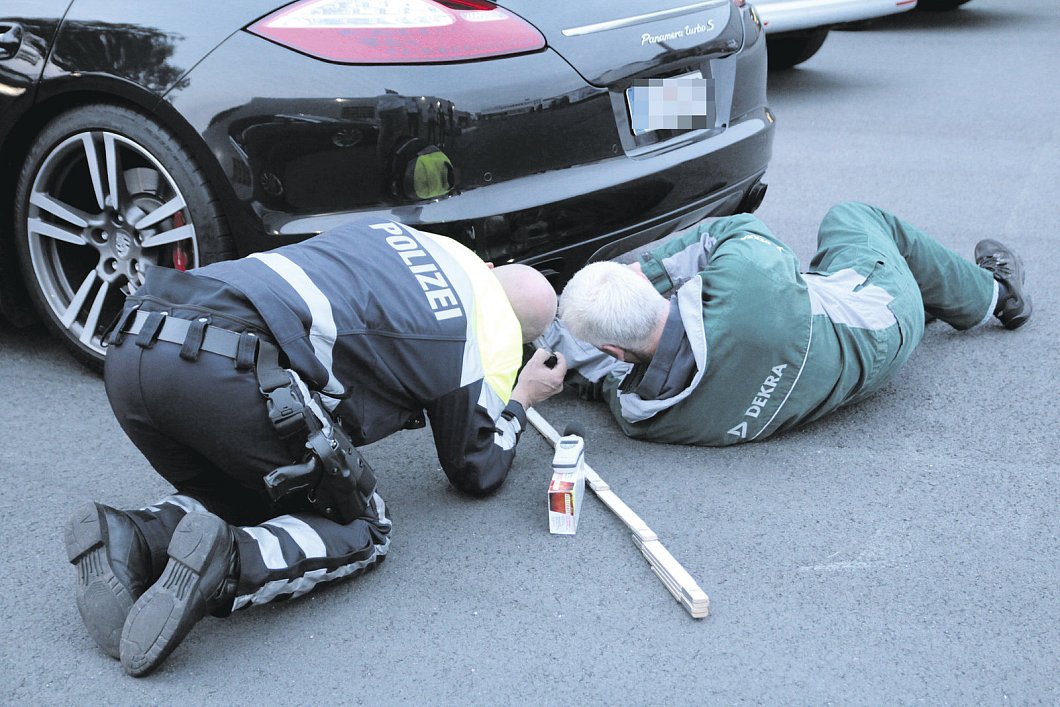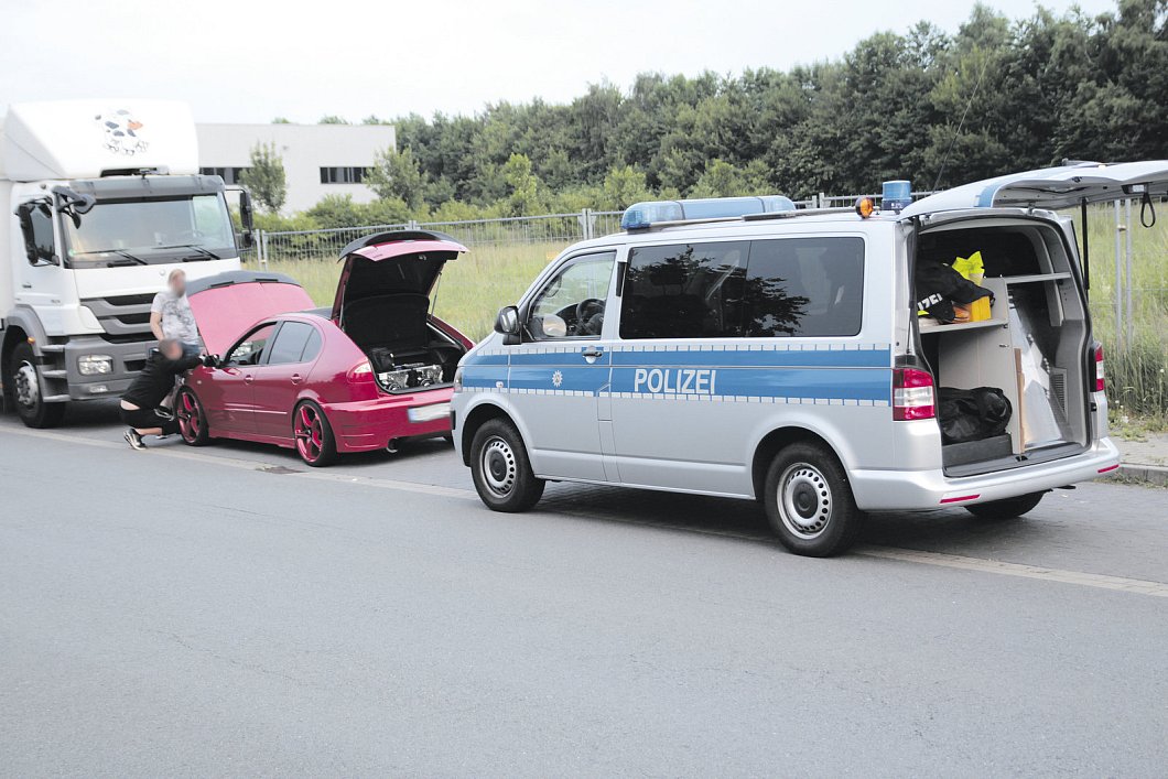 Am hinteren Teil der Röntgenstraße haben Thorsten Ronning und seine Kollegin einen roten Seat Leon angehalten. Weiterfahren darf er nicht. Im Kofferraum steht eine große Bass-Box. Die Polizei kontrolliere die Fahrtüchtigkeit und die Straßenverkehrs-Zulassungs-Ordnung (StVZO). Oft würden selbst einfache Vorschriften nicht erfüllt, wie einen Verbandskasten, ein Warndreieck und eine Warnweste mitzuführen, erlärt Ronning. Stattdessen werde der Kofferraum dafür genutzt, um Boxen oder Werkzeug mitzunehmen.