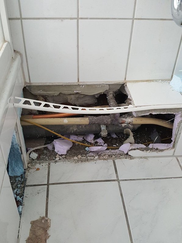 Samstag, 10. Juni: Der fünfte Monteur klopft im Bad von Elisabeth Weis weitere Fliesen ab, führt in die Rohre eine Kamera mit Kabel ein – das ist zu kurz. Auch er empfiehlt einen Leckorter.