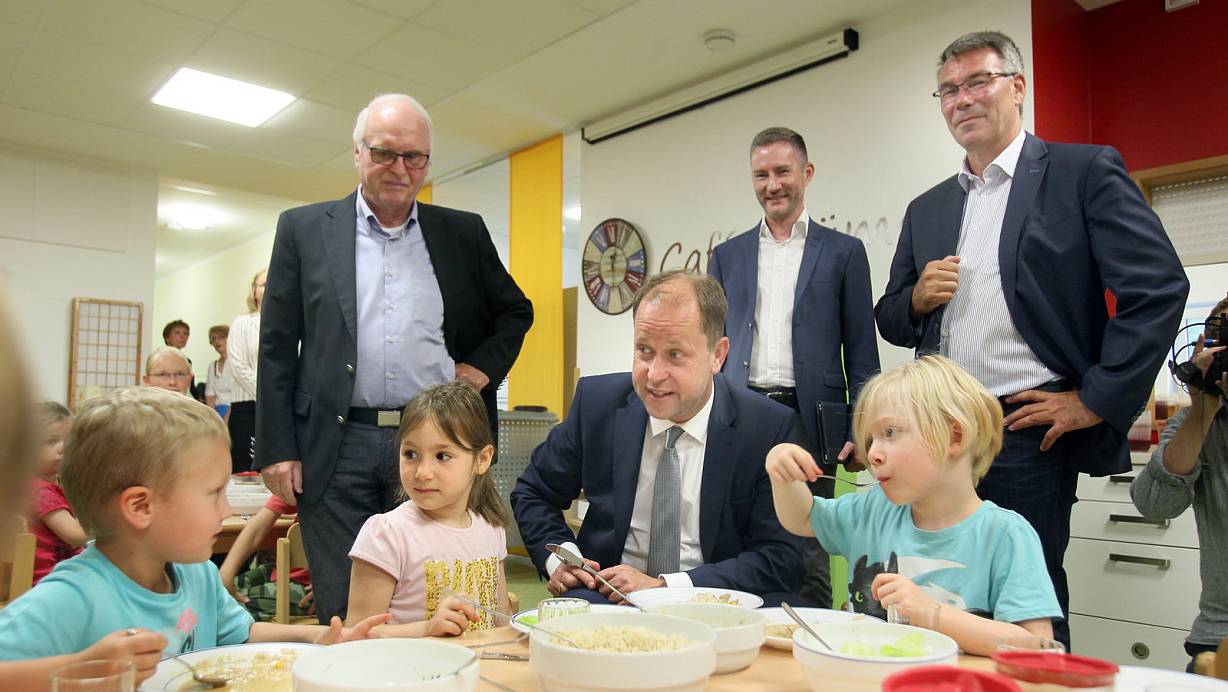 Das Essen schmeckte Minister Joachim Stamp, wie auch den Kindern der AWO-Kita Schwarzenmoor. Der AWO-Vorsitzende des Präsidiums Norbert Wellmann (v. l. hinten) und Landtagsabgeordneten Stephen Paul (FDP) und Christian Dahm (SPD) gingen leer aus. | © Frank-Michael Kiel-Steinkamp