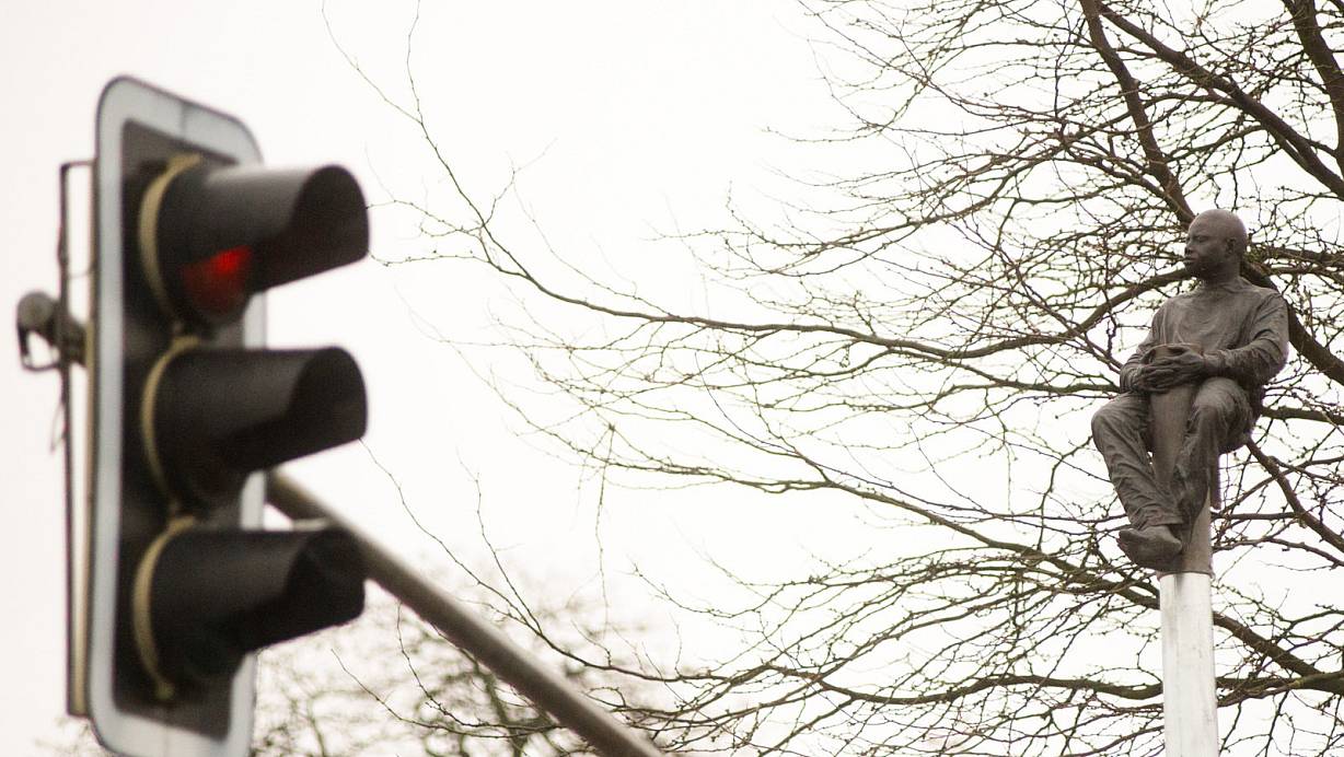 Melilla Mauerspringer: Fernando Sánchez Castillo schuf die Skulptur auf dem Mast unter dem Eindruck von Bildern mit flüchtenden Menschen, die beim Versuch Europa zu erreichen Grenzzäune überklettern. Europa stellt die Signale inzwischen auf Rot. | © Ralf Bittner