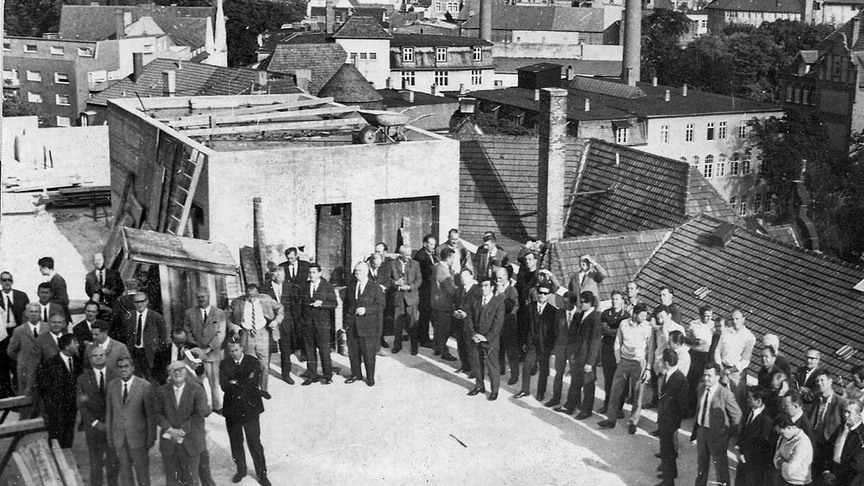 Herrenrunde: Das Richtfest im August vor 50 Jahren. Im Hintergrund die Neustadt. | © Georg Heese (Kommunalarchiv)