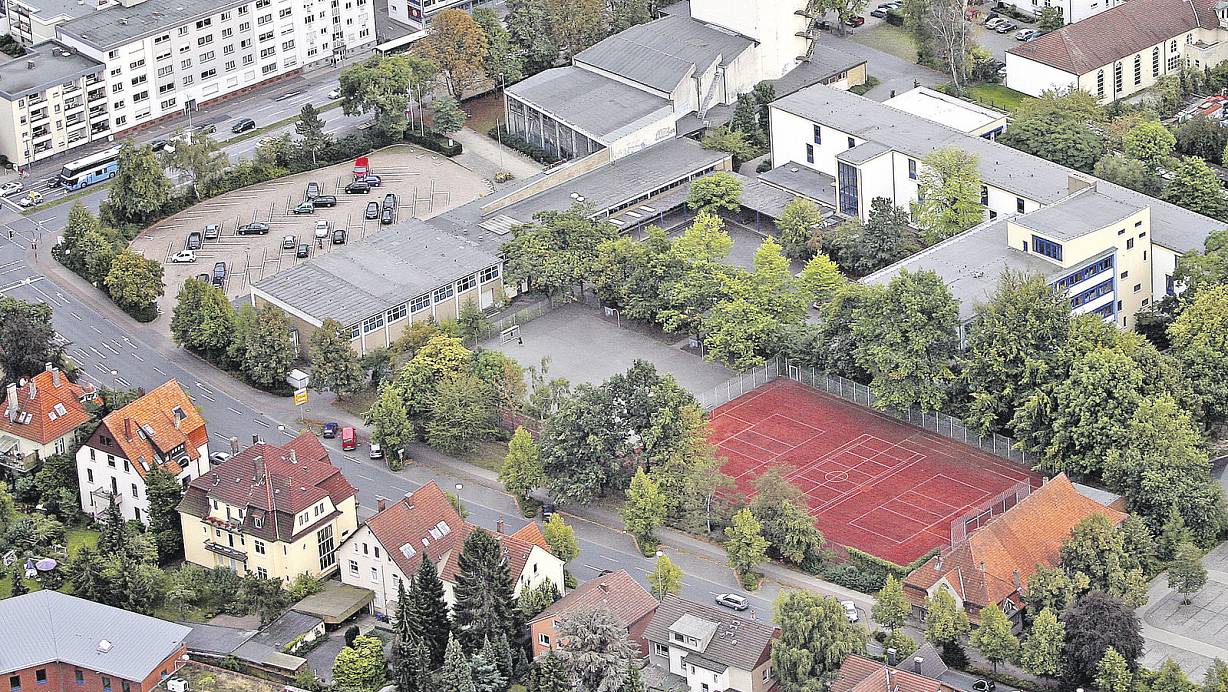 Das Ravensberger Gymnasium von oben: Am unteren Bildrand verläuft die Hansastraße. In der Mitte sind die Schulgebäude zu sehen. Das Stadttheater (oben links) dient als Aula. Neben dem Parkplatz (links) befindet sich die Sporthalle. Am rechten unteren Bildrand steht neben dem Kleinspielfeld die alte Turnhalle Lübberbruch. | © Frank-Michael Kiel-Steinkamp