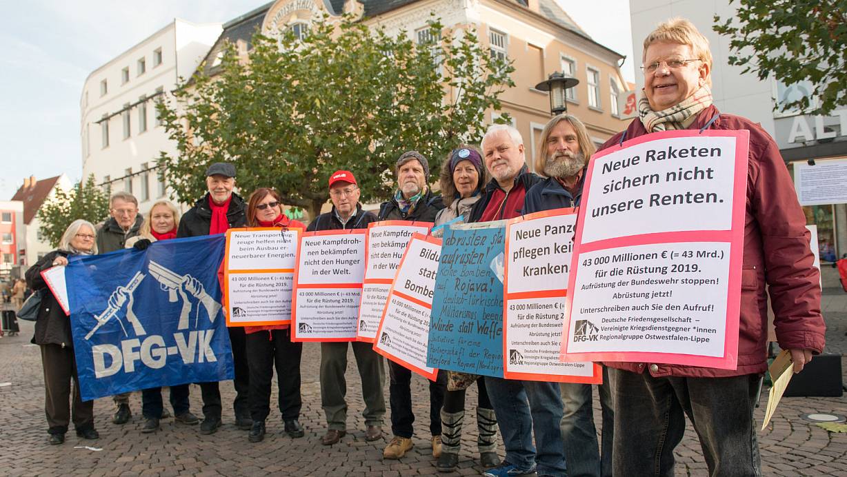 Kundgebung: Die Mitglieder der Deutschen Friedensgesellschaft machen auf die geplanten Erhöhungen des Rüstungshaushaltes aufmerksam und fordern eine grundsätzlich andere Politik