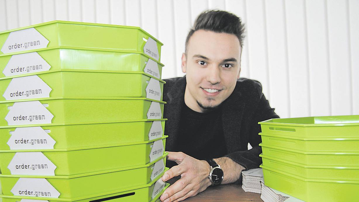 Wiederverwendbar: Hendrik Single hat ein Mehrweg-System für die Pizza-Auslieferung erdacht. Die runde Köstlichkeit wird per Pizza-Bow in achteckigen, grünen Boxen ausgeliefert. Dadurch soll der Müll eingespart werden, der durch sperrige Kartons anfällt. | © Natalie Gottwald