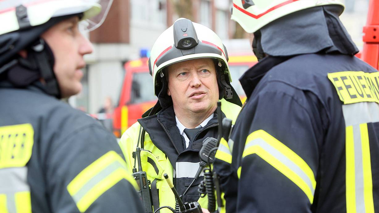 Abstimmung: Feuerwehrchef und Einsatzleiter Michael Stiegelmeier an der Brandstelle, Lübberstraße 2. | © Frank-Michael Kiel-Steinkamp
