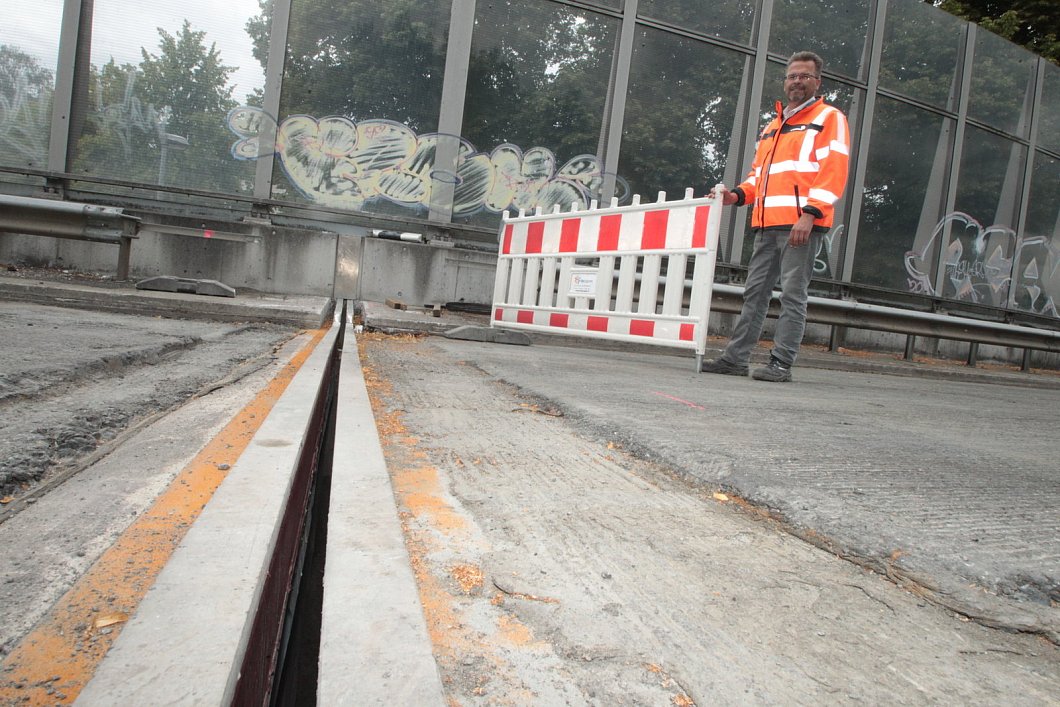 Herford. Routiniert schreitet Bauüberwacher Detlef Lüking zum Ort des Geschehens. Eine etwa zehn Zentimeter starke Lücke spannt sich über die gesamte Breite der Zufahrt von der Herforder Umgehungsstraße zur Autobahn 2 in Fahrtrichtung Dortmund. „Insgesamt sind es sechs dieser Fahrbahnübergänge vom festen Untergrund zum Brückenbauwerk, die wegen Verschleiß erneuert werden müssen", sagt Lüking, der Beschäftigter des Landesbetriebs Straßen NRW ist.