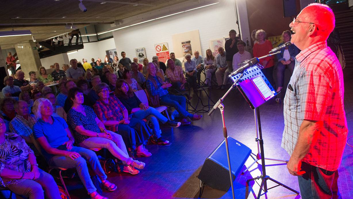 Volles Haus: Ray Moses singt ein Solo. Mit seiner Frau Lea gehörte er in den 1970er Jahren zu den Urgesteinen des Gallows Folk Clubs. Bis heute ist er in mehreren Chören und im Vorstand des Lippischen Sängerbundes aktiv. | © Ralf Bittner