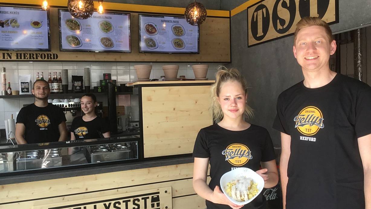 Gastronom Sven Klatt (r.) hat das Tellys bereits im Probebetrieb. Ihm zur Seite stehen (v.r.) Stefanie Zavaglia, Angelina Aldergot und Marcel Kania. | © Corina Lass