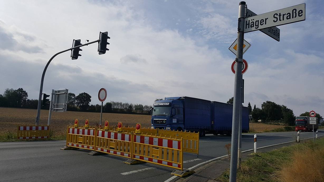 Mittwochmorgen: Die B 61 wird zwischen Herford und Löhne gesperrt. Hier ist die Sperrung an der Hägerstraße in Löhne zu sehen. Die Lastkraftwagen kommen aus Richtung Herford. Foto: David Knapp | © David Knapp