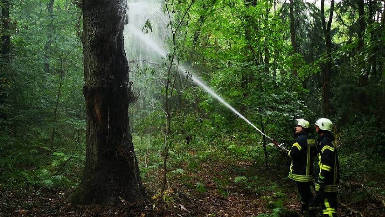 Am Stukenberg hat der Blitz in eine Eiche eingeschlagen. Ein aufmerksamer Anwohner bemerkte den Brandrauch und den Geruch und erkundete deshalb mit dem Fahrrad den Wald. Dabei fiel ihm ein brennender Baum auf und er alarmierte die Feuerwehr.