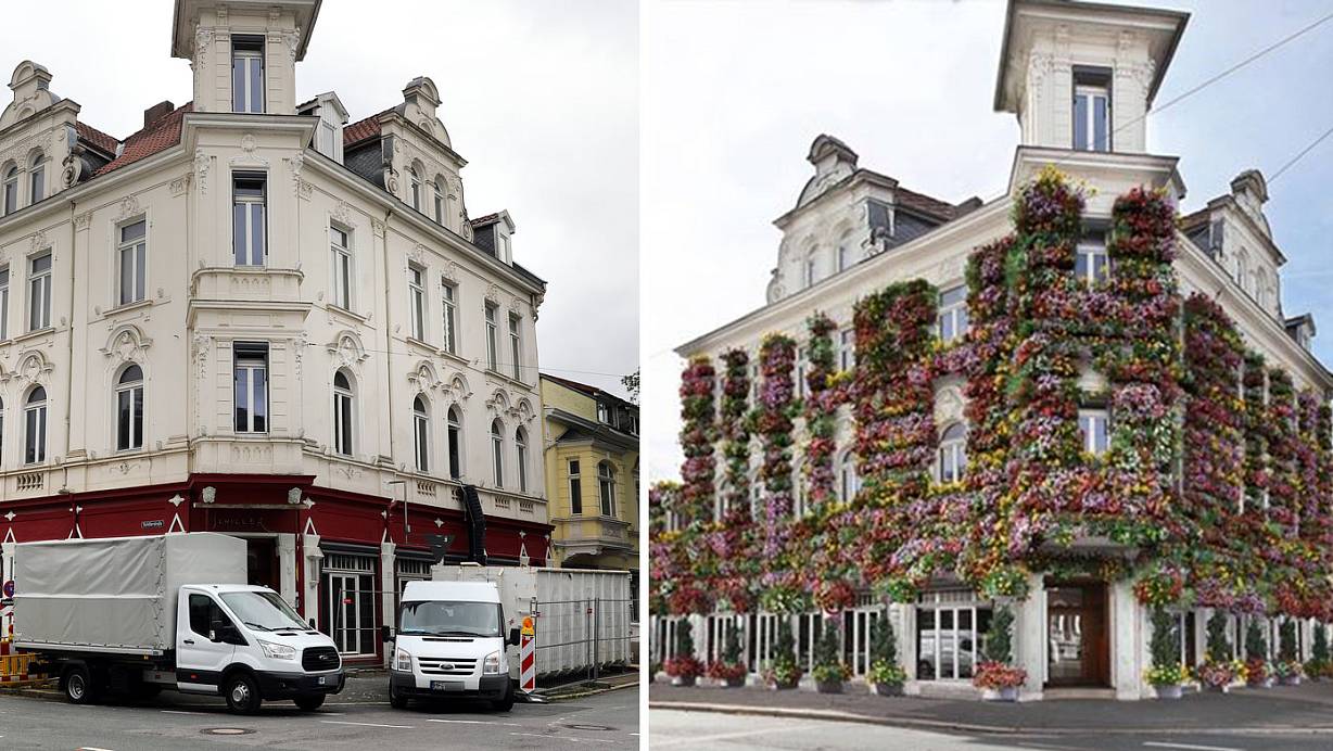 Das Schiller ist derzeit eine Baustelle. Die Blütenfassade ist eine ältere Animation. Sie wird sich nach neuester Planung in der dritten Etage nur auf Blumenkästen beschränken. | © Frank-Michael Kiel-Steinkamp/Montage: Uhlen
