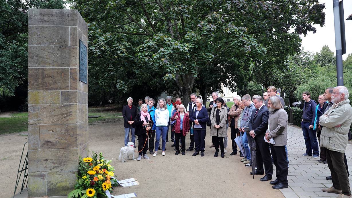 Schweigeminute: Am Mahnmal für die Opfer des Faschismus in der Nähe des Daniel-Pöppelmann-Hauses legten Bürgermeister Tim Kähler und vertreter des Kuratoriums Erinnern, Forschen, Gedenken Kränze nieder. | © Frank-Michael Kiel-Steinkamp