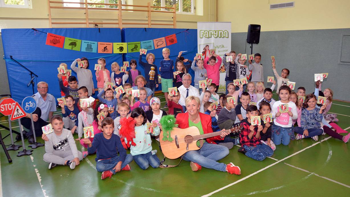 Premiere: Die Sängerin Faryna stellte in der Grundschule Mindener Straße in Herford ihre CD "Sicher im Straßenverkehr" vor. Mitten zwischen den Erstklässler sitzen der Leiter des Verkehrsdientes der Polizei, Michael Steffen, und Landrat Jürgen Müller. | © Kreis Herford