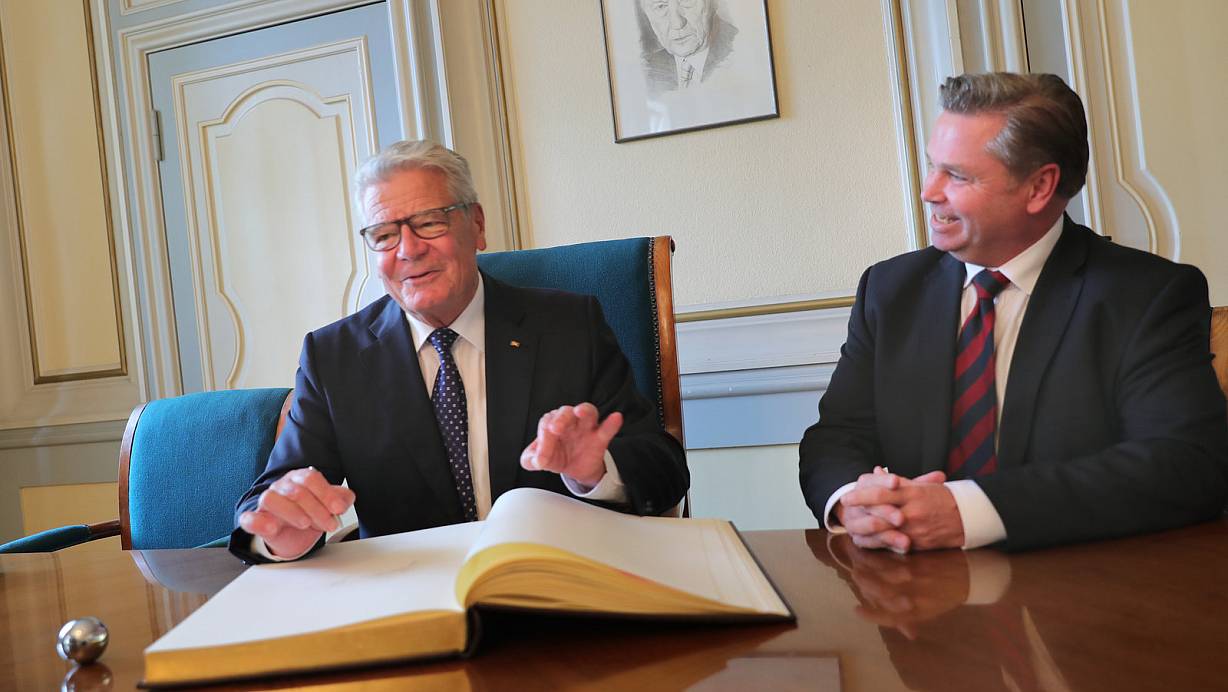 Der frühere Bundespräsident Joachim Gauck hat sich in das Goldene Buch der Stadt Herford eingetragen. Er wurde empfangen von Bürgermeister Tim Kähler. | © Frank-Michael Kiel-Steinkamp