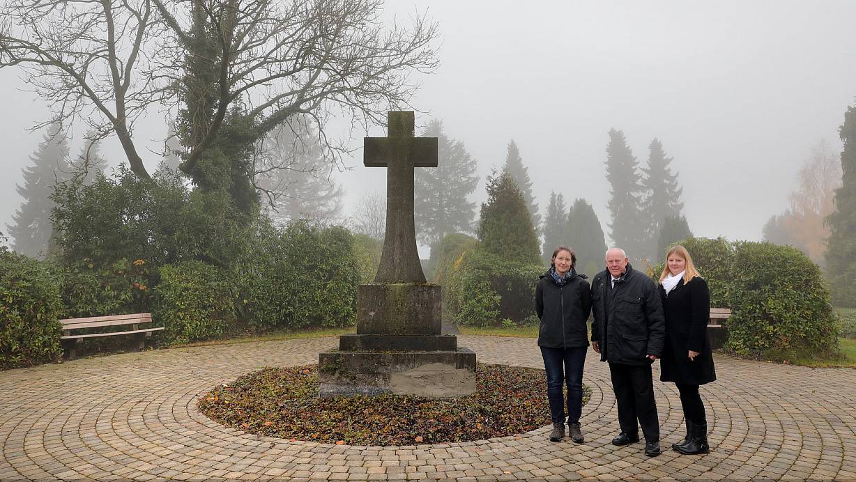 Friedhofsverwalterin Melanie Heaps (v.l.), Bestatter Heinrich Stranghöner und seine Mitarbeiterin Eleonora Mathioudakis an der historischen Stätte. | © Frank-Michael Kiel-Steinkamp