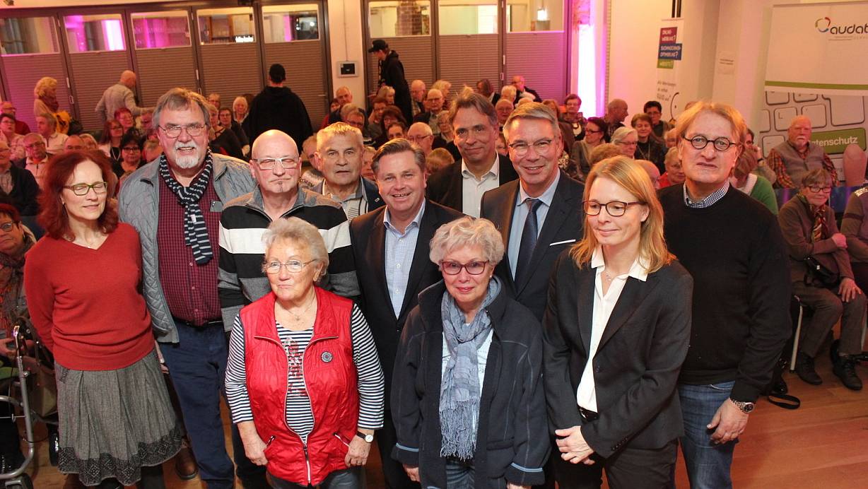 Karin Buhre-Rödel (v.l.), Helmut Noll, Uwe Bertram, Liesel Drommershausen, Josef Gebel, Tim Kähler, Elke Meyer, Johannes Baumann, Christian Dahm, Anke Esdar und Andreas Rödel bei der Jahresabschlussfeier des VdK-Ortsverbandes Herford im Denkwerk. Foto: Horstmann | © Eike J. Horstmann
