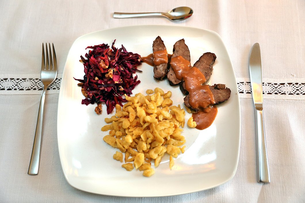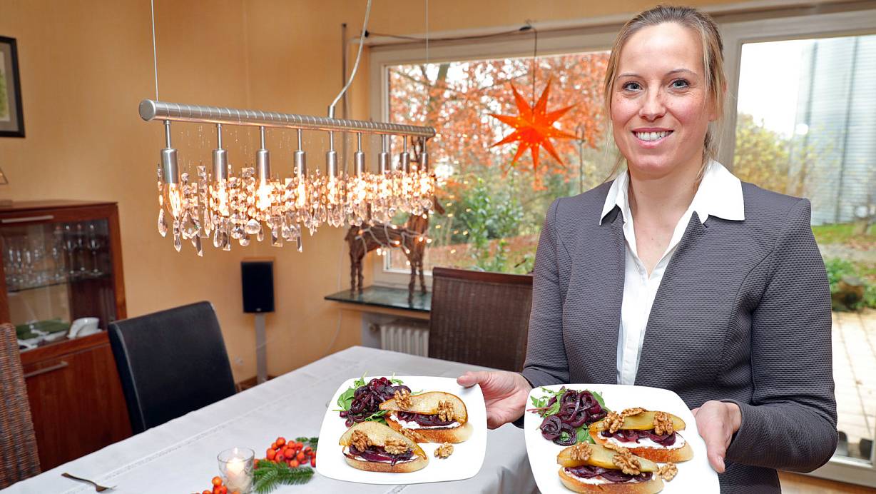Sie hat sich für ein Drei-Gänge-Menü entscheiden. Es beginnt mit Birnen-Ziegenkäse-Crostini mit Walnüssen, das Hauptgericht sind geschmorte Schweinebäckchen mit selbst gemachten Spätzle und Rotkohlsalat. Zum Dessert gibt es Apfel-Haselnuss-Crumble mit Vanillesoße.