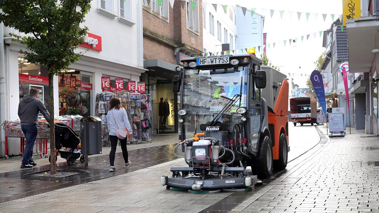 Die Reinigung des Natursteinpflasters mit einer Kehrmaschine des Unternehmens Wellteam zeigte in den neu gestalteten Teilen der Fußgängerzone - hier in der Bäckerstraße - bessere Ergebnisse als andere Versuche. | © Frank-Michael Kiel-Steinkamp