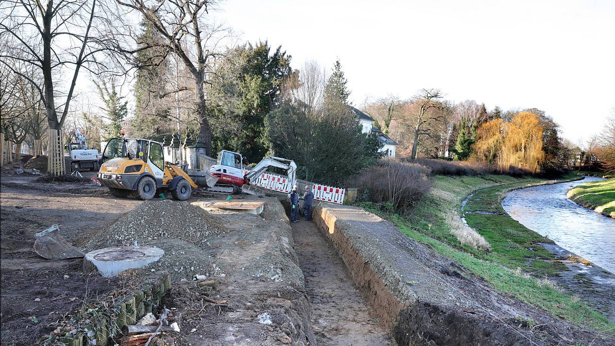 Die Bauarbeiter bereiten das Fundament für die Sitzbänke am Werreufer vor. Die tonnenschweren Betonteile werden in der nächsten Woche angeliefert. | © Frank-Michael Kiel-Steinkamp