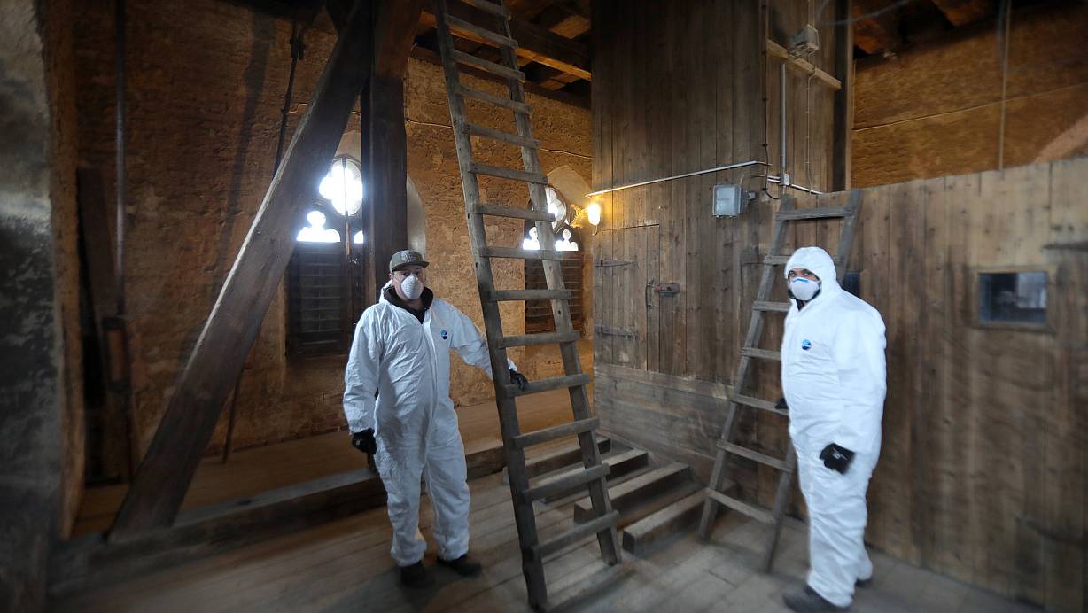 Männer in weißen Schutzanzügen sind hoch in den Kirchturm gestiegen. Sie haben ein aggressive Substanz aus dem Glockenstuhl entfernt und eimerweise ins Freie getragen.